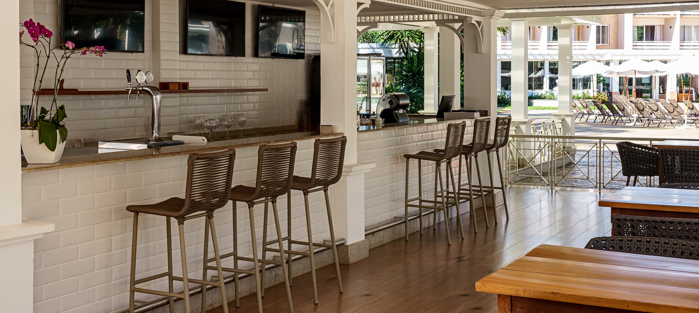 Sucos, drinks e petiscos ao lado da piscina. Diariamente: das 10h às 19h. Sextas e sábados: Almoço Parrilla Argentina (custo adicional).