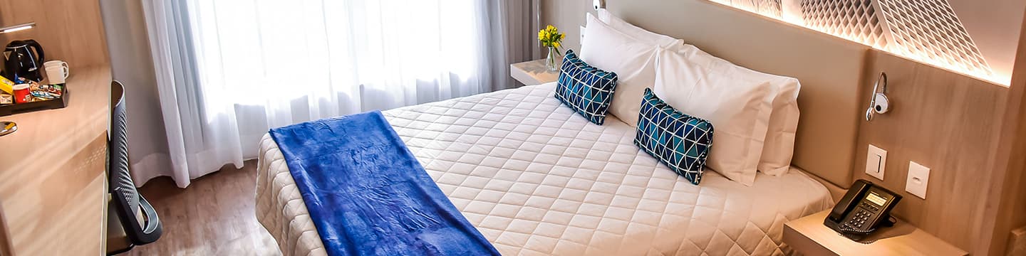 Este apartamento de 20 m², oferece duas camas de solteiro king e diferenciais pensados para duas pessoas: estação de trabalho com duas cadeiras e dois cofres digitais. O ambiente possui isolamento acústico, design moderno e banheiro com pia externa.